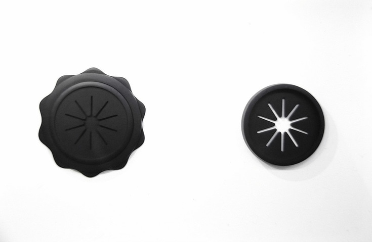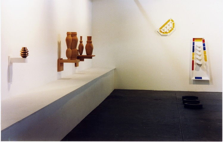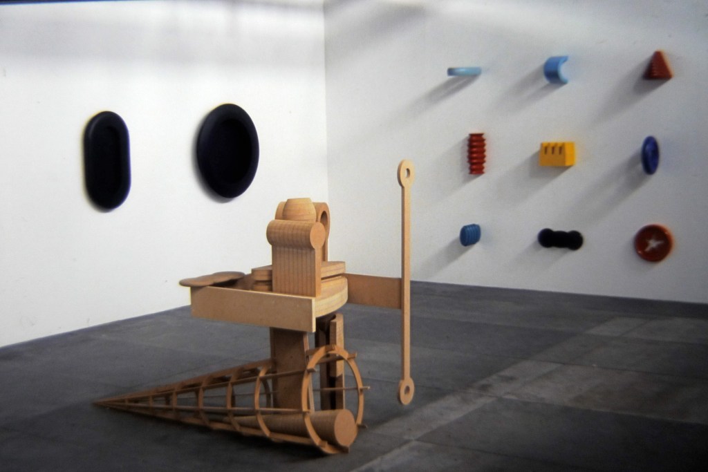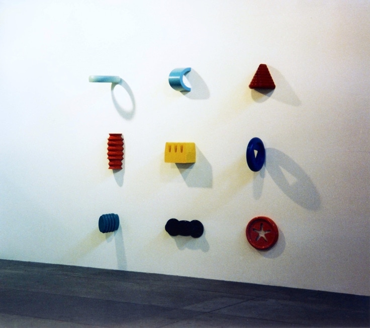 “Nine coloured objects are attached to the wall in a grid. They look like parts of an educational toy. There’s a blue disc with a triangular slot and a red one with a star shaped hole through which to post the appropriately shaped bricks. But the solids don’t match the gaps. At a pinch, the elliptical shaft might slide through the elliptical ring above it; on the other hand, the ridges might interfere. The yellow crown-like object has no matching receptacle, nor does the maroon half-ziggurat. These odd shapes could be based on (mis) remembered playthings from childhood, or on things that David Fusco has found on a beach and can’t positively identify…but beautifully crafted in wood and painted, these wall sculptures employ an elegant formalism to resist banal attributions.